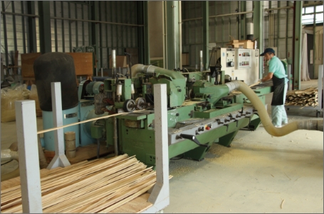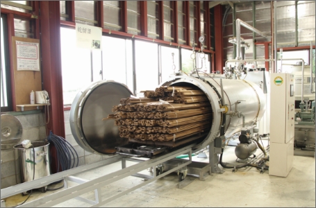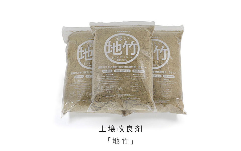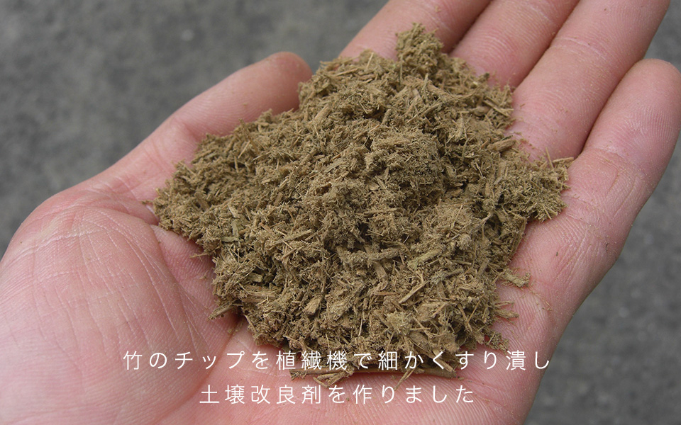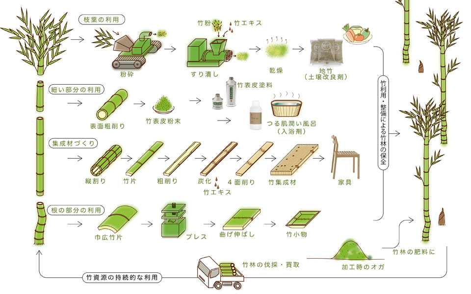 1本の竹を伐採しメイン部分は竹集成材にし堅くて丈夫な家具に、 少し上の細い部分は表皮を活かし塗料や入浴剤に、 枝・葉は粉砕し竹エキスを加えた土壌改良剤へと。 美しい真備の竹林で育った竹が当社を経て竹家具になり、 そして土壌改良剤になり土に還ることで美しい竹林になっていく。