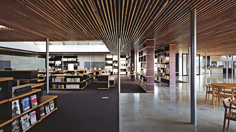 水平材が、書架から展示棚・ベンチ・閲覧テーブルなどにつながっていく、