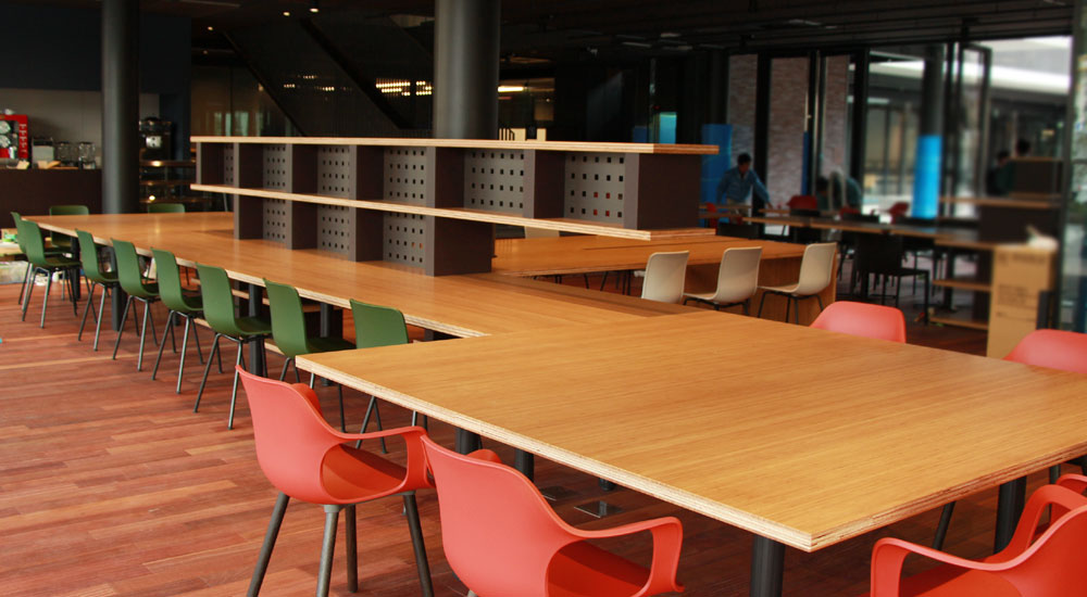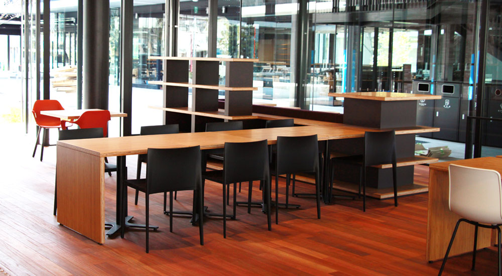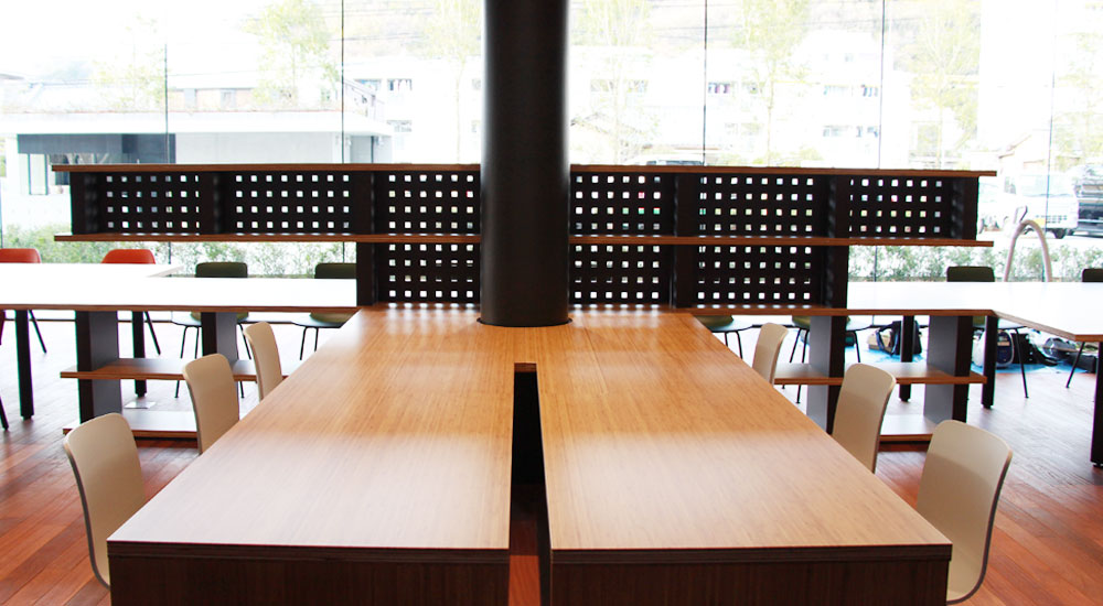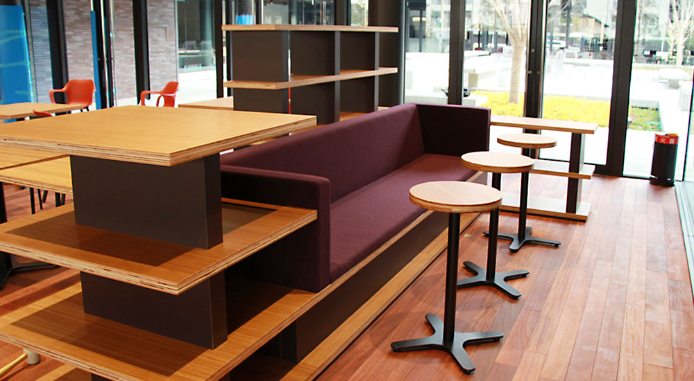 愛媛県にある大学の、玄関口となるカフェコーナーの家具製作を担当しました。