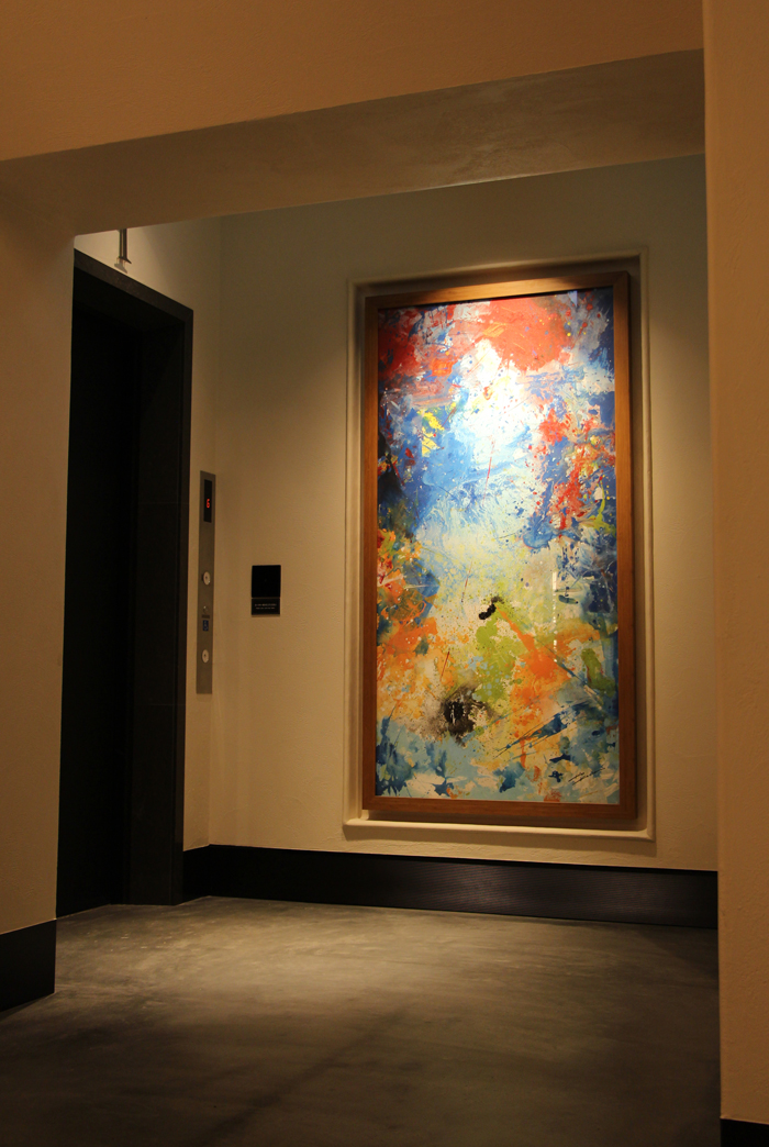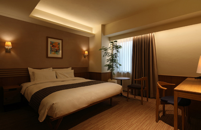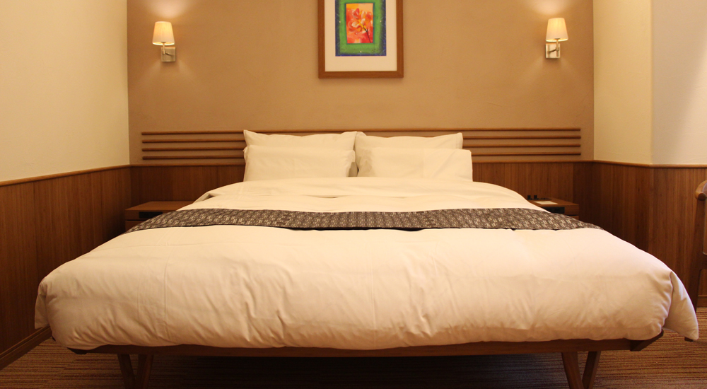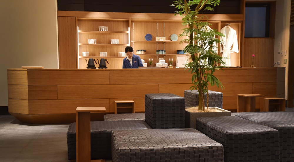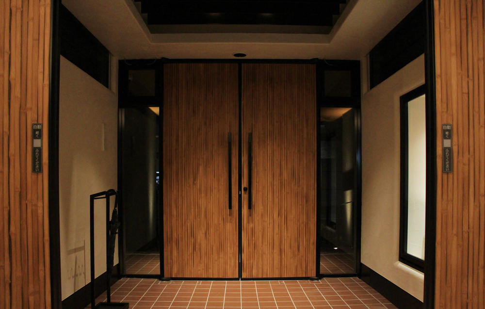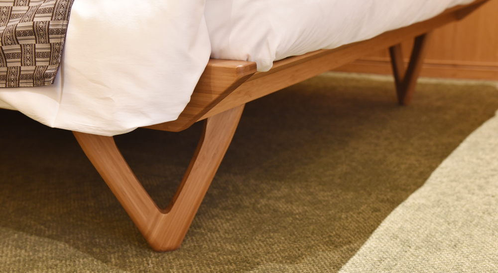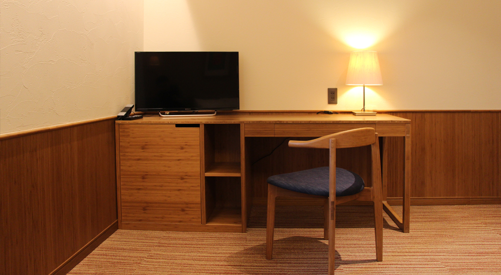 福岡市のエアコンを使わない 「ホテル グレートモーニング」様の家具をトータルに制作しました。 キーアイテムのベッドをはじめ、ホールのカウンター、各階のミラー、アートフレーム。 照明や、玄関扉の部材まで、竹の内装にこだわった作りのホテルです。