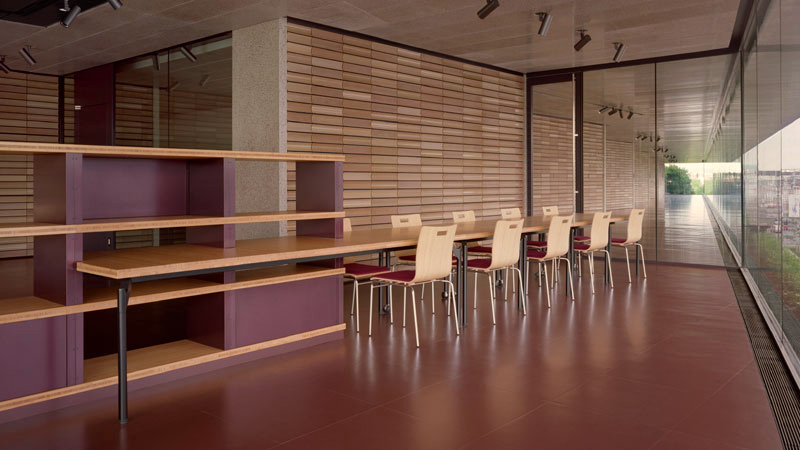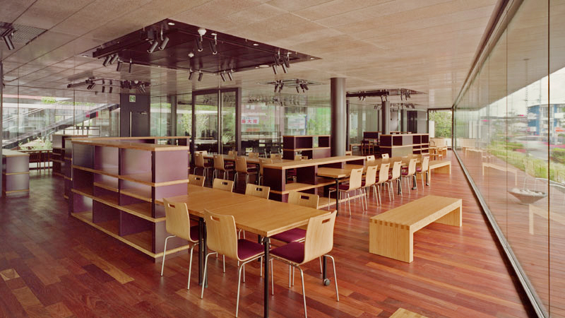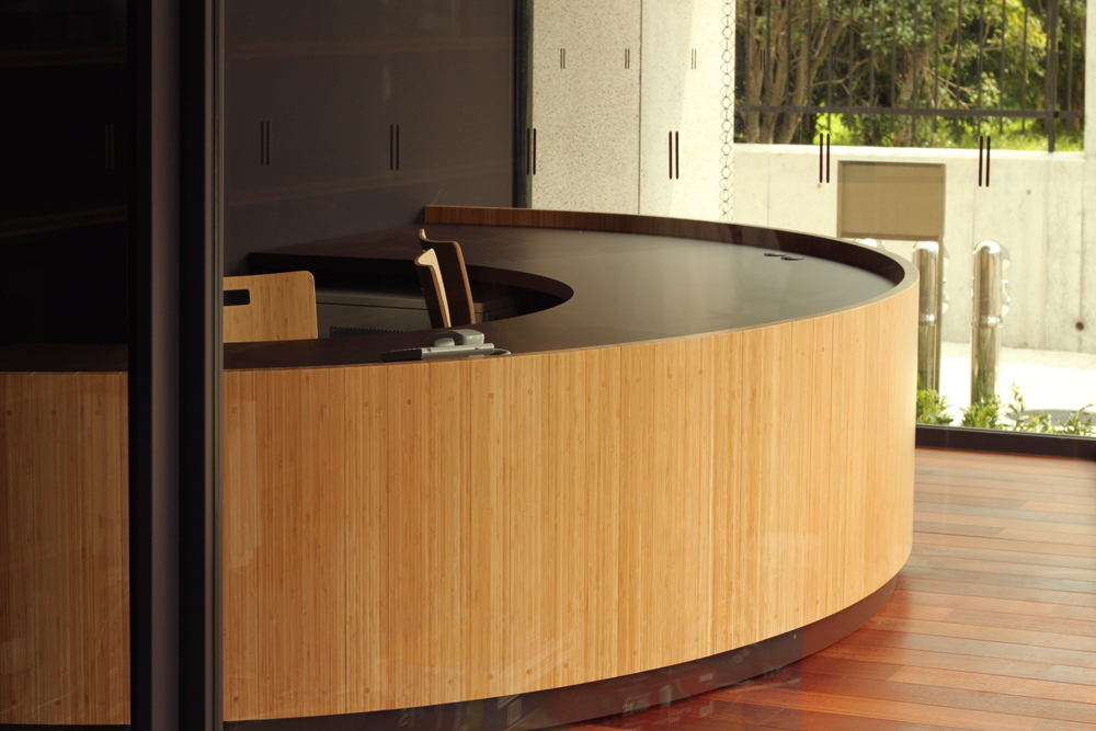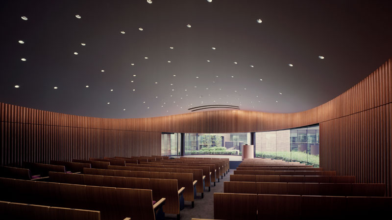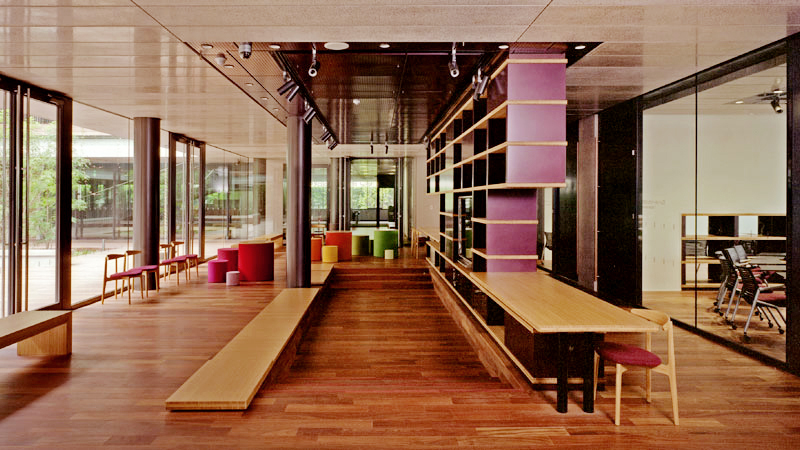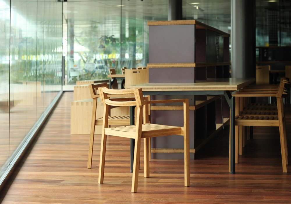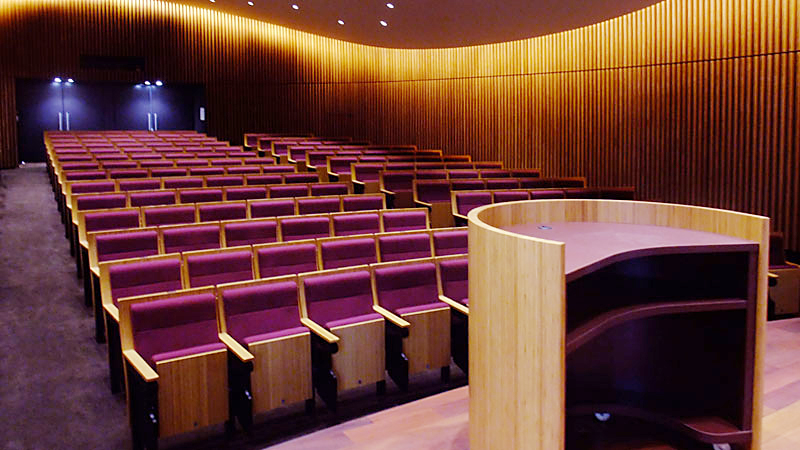 講堂用の壁面ルーバーや、講義用椅子の背もたれなど、建物全体が竹の質感で統一されています。
