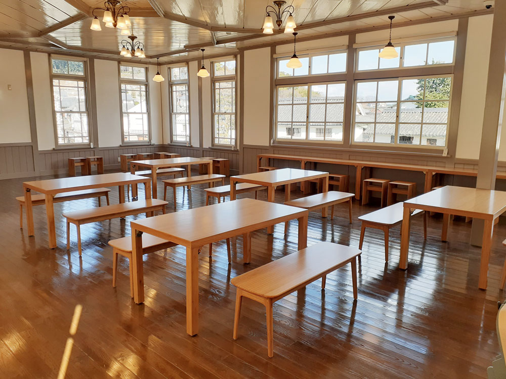 倉敷市美観地区の観光案内所「倉敷館」に家具をご採用頂きました。 建物は大正に建てられた市の重要文化財で、内装もクラシックな趣があります。 テオリでは、1Fではベンチ、 2Fではベンチとテーブル、スリットスツールを製作しました。 また各階のゴミ箱も竹製で制作させていただいています。