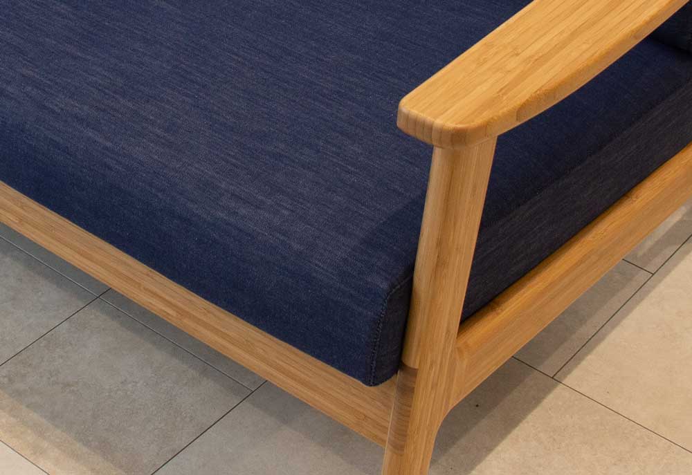 ソファ、椅子の張地:デニムは児島ジャパンブルーの「SHINDENIM(シンデニム)」を使用。 家具にも使用可能な色移りしない特殊な加工を施してある。