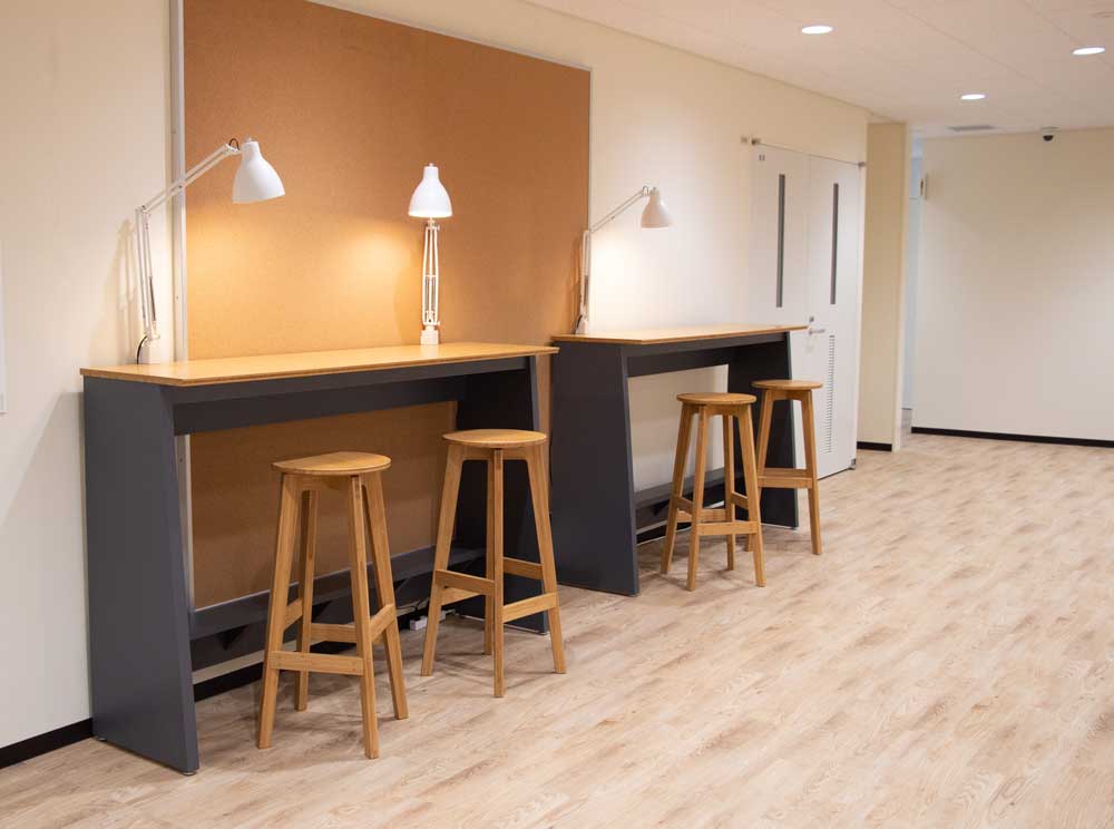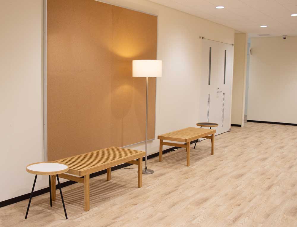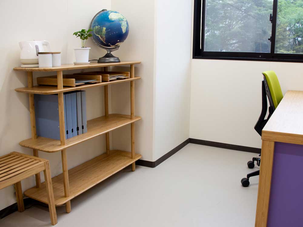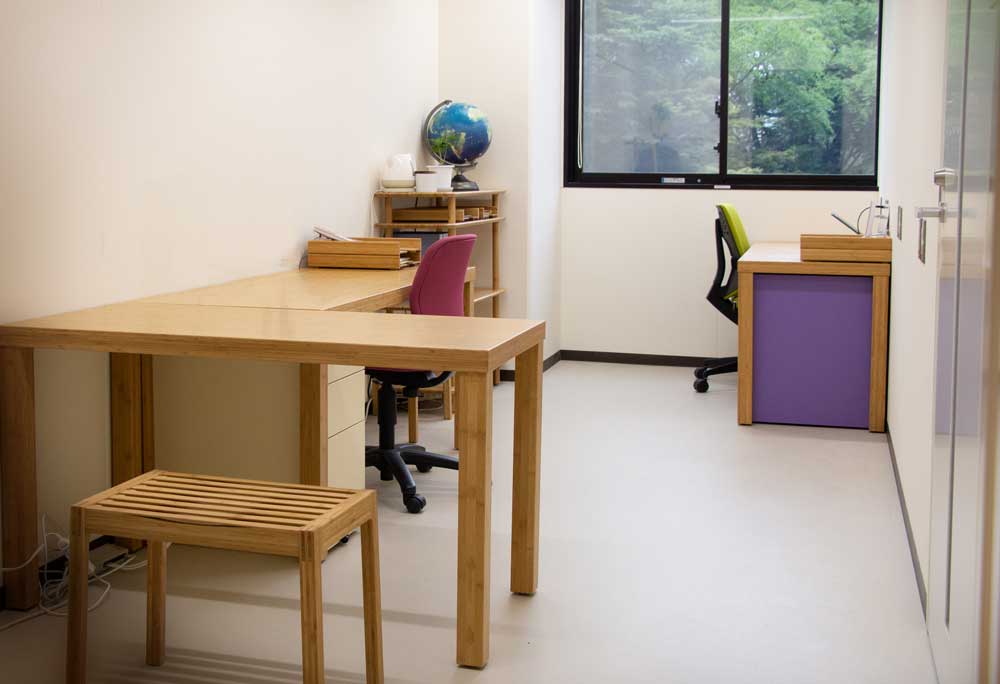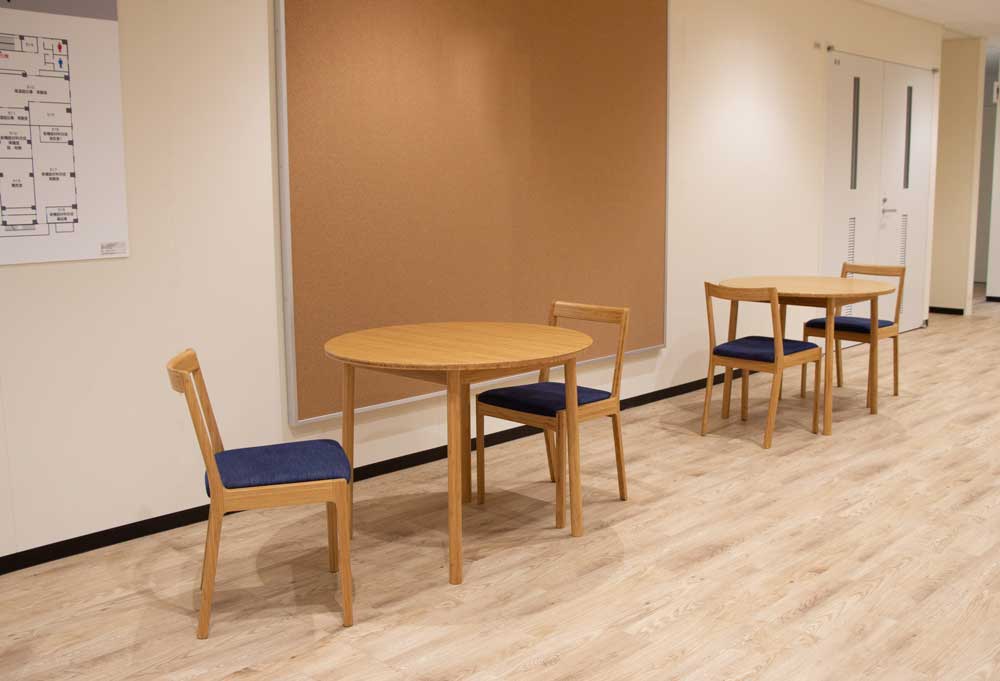 2021年の新棟建築に合わせて、エントランススペースと、各階共用スペースに家具を採用頂きました。 ソファや椅子の張地には地元倉敷市児島のデニムを使用しています。 各階の家具は休憩スペースだけでなく、研究発表や情報交換の場としても使われる予定です。