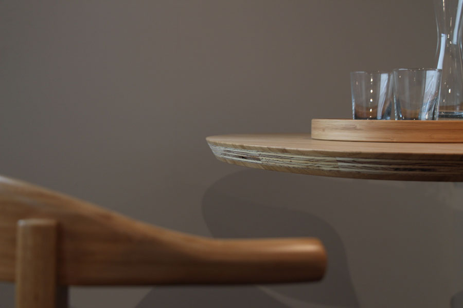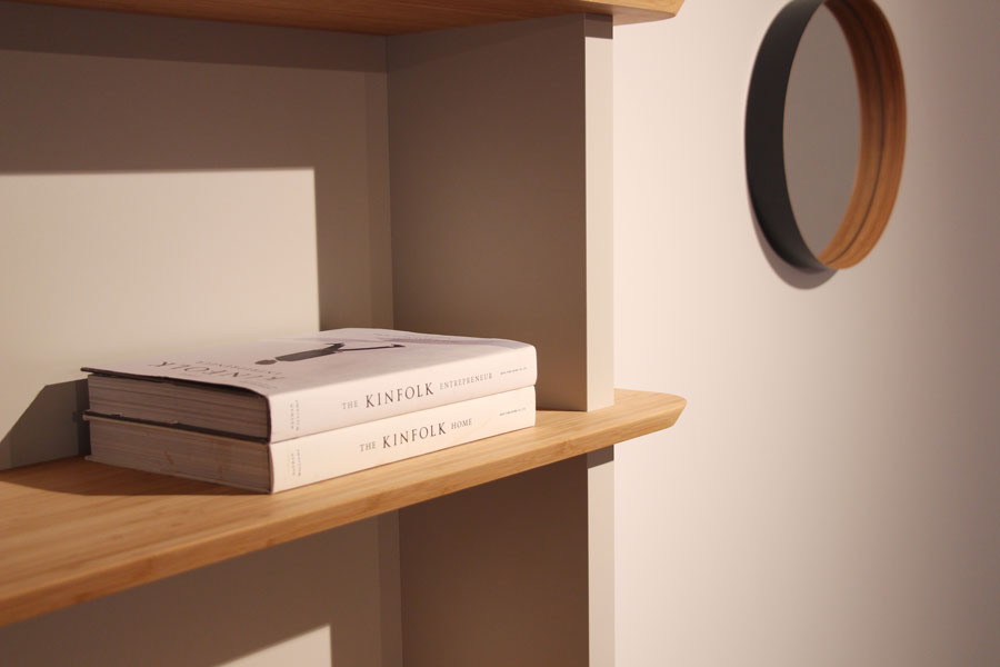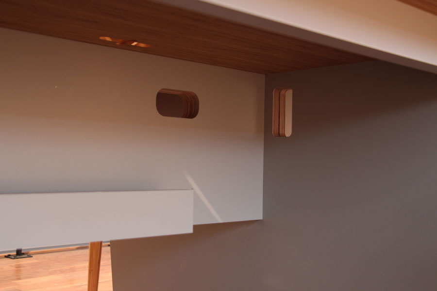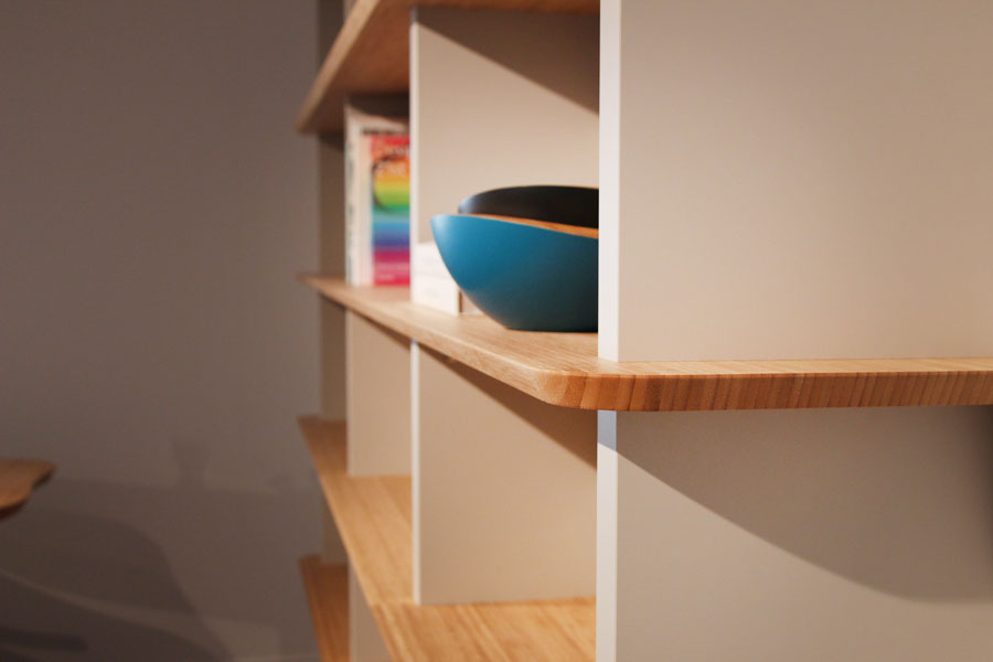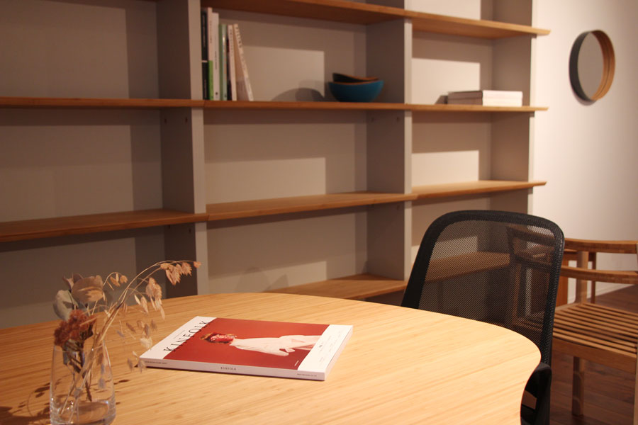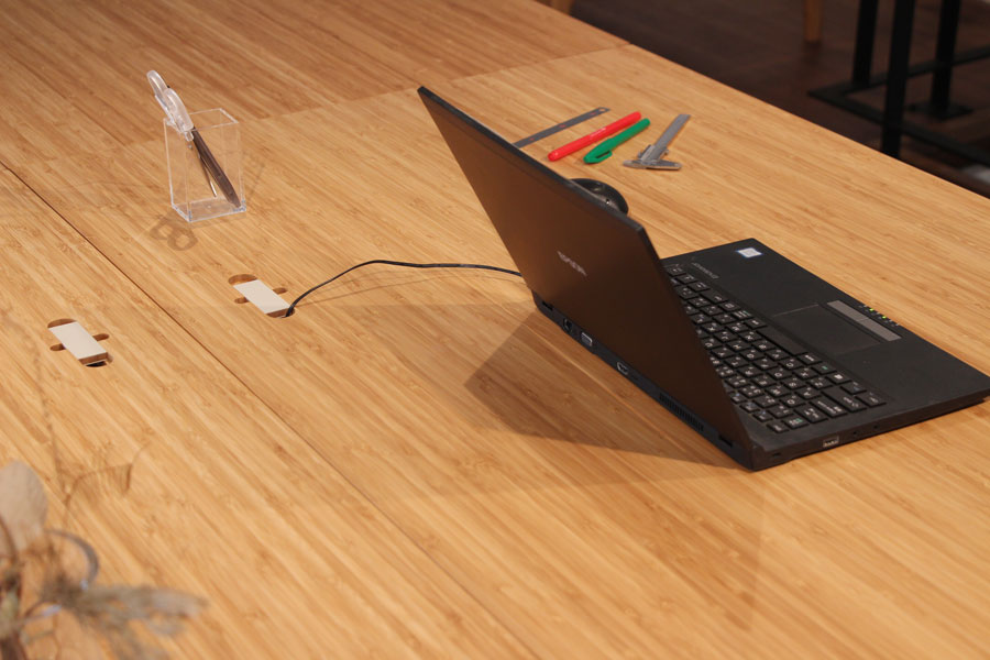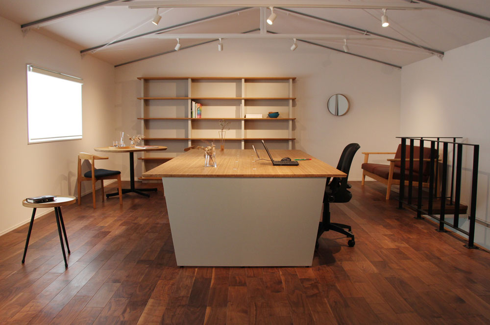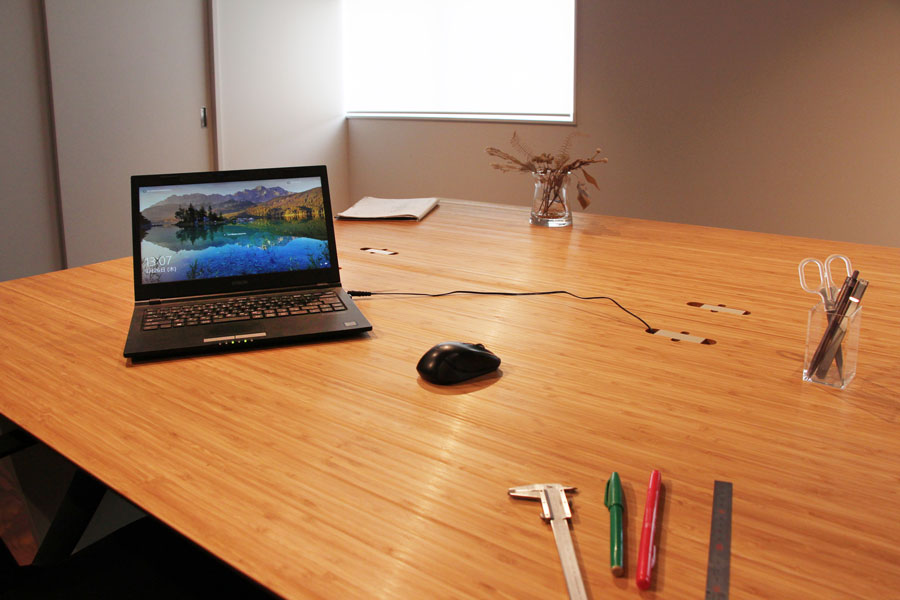 自社の事務所の為に家具を製作しました。 竹集成材をメイン素材にし、メラミン化粧板を加えることで よりオフィスにふさわしい顔つきに仕上げました。 デスクの配線に対応しながらも 既製品の金具に頼らず、統一感のある仕上がりになっています。 (写真はショールームにて撮影)