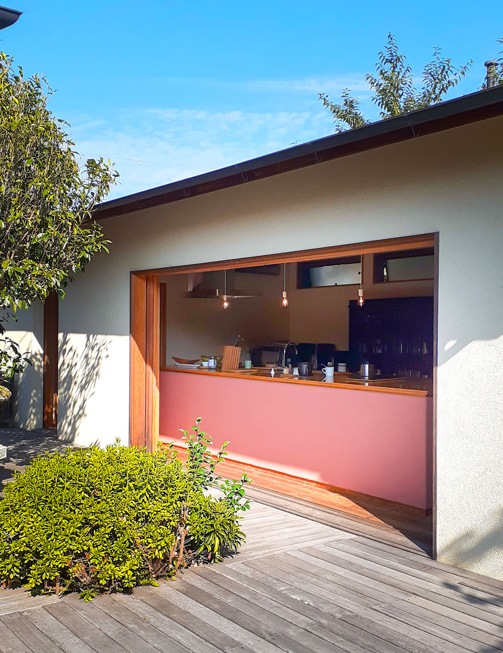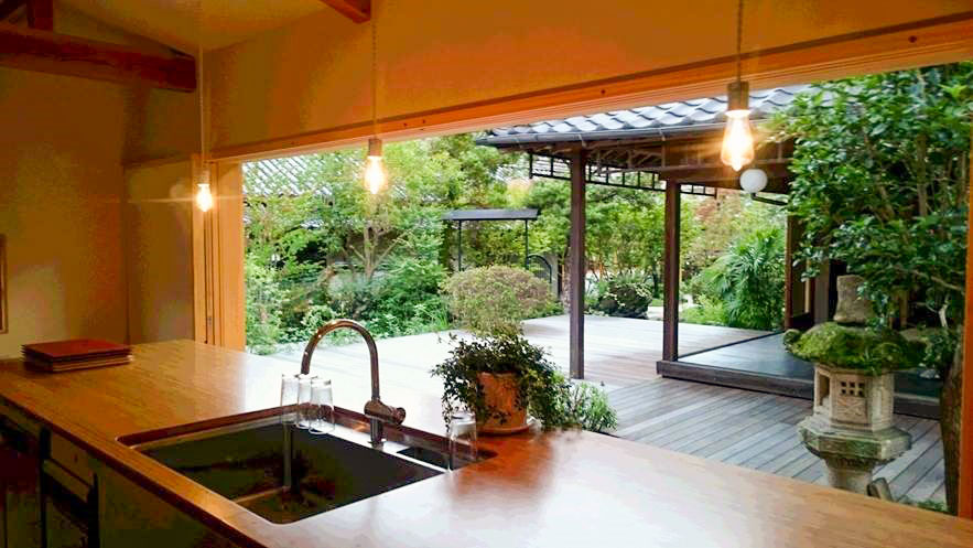キッチンの戸を開くと、母屋と庭の景色を額縁の様に切り取ってくれる |