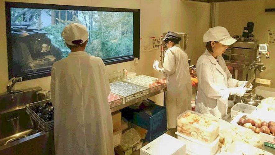 長屋門の中では、日々スタッフが季節の果物と向き合っています。特に夏は、桃祭り状態で早朝から夕方まで大忙しです。ジャムを作る上で、工房に本来窓は必要ありませんが、ジャムを充填する場所に大きな窓を設けています。あの窓からは原田邸のビオトープの水や緑、季節を感じることが出来ます。実は改修前、この窓の向こうに土塀がありました。今、ここに崩れた塀が見えていますが、これは働くスタッフの目通りを考えて、この部分の塀を取り除きました。よくワークライフバランスという言葉を耳にしますが、誰しも人生において一番多い時間が働く時間です。季節を感じながら季節のジャムを作る。ここでは、働く時間の中のワークバランスを考えています。旧原田邸は、私たちスタッフにとって仕事場でありながら、自然や季節に寄り添える場です。工房スタッフは毎朝つばめの巣を気にかけ始業、休憩時に木々の芽吹きや色付きに足を止め、さくらんぼやブルーベリーの季節にはちゃっかり手を伸ばします。日々この窓から、ビオトープの水や緑、季節を感じながら、季節のジャムを作っています。