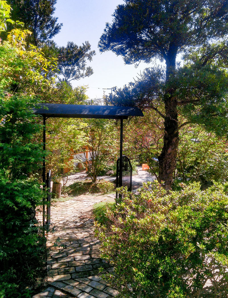 ビオトープの工事と同時に、庭師の福田さんは「水と緑」に母家からそのまま近づいて行ける広い縁側、デッキを造作してくれました。また、元々あった樹木や灯篭は、デッキをくり抜きそのままの位置に生かされています。このデッキでつなぐ「水と緑」により、私の中で生まれた発想が、母家から独立させたキッチンの棟です。母家にもビオトープにもデッキでつながっています。