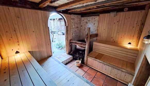 手前の木製扉がかわいい小屋がフィンランド式サウナ