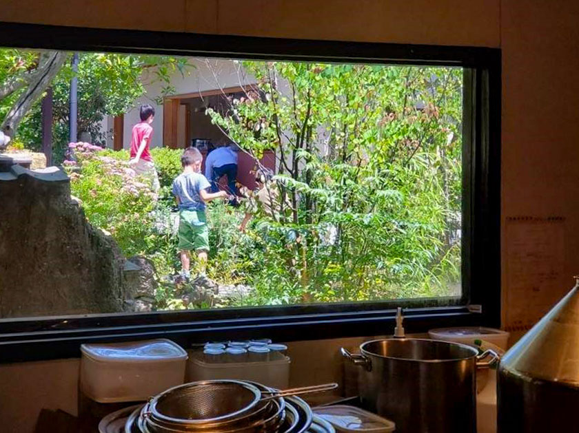 長屋の工房からはビオトープで遊ぶ子供達の姿を見ることも出来る