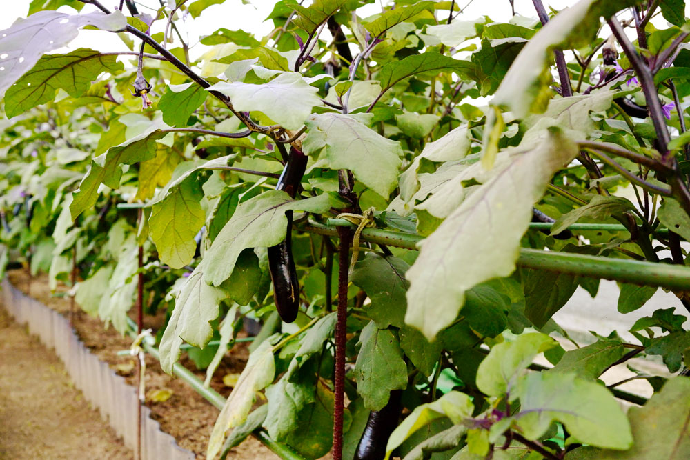 露地栽培の長ナスは、シーズンの終盤を迎えても葉が青々と茂り、色艶の良い果実が収穫を待っています。