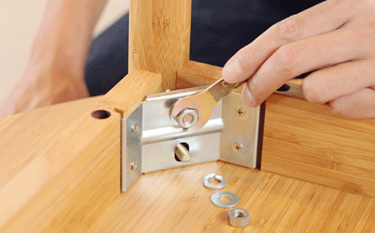 付属の工具で天板裏からナットを回してとめて組み立てて頂きます。