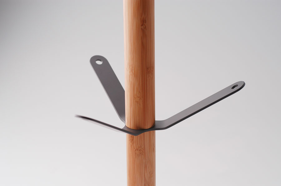フックとベースにスチールを、支柱に竹集成材を使用したコートハンガーです。