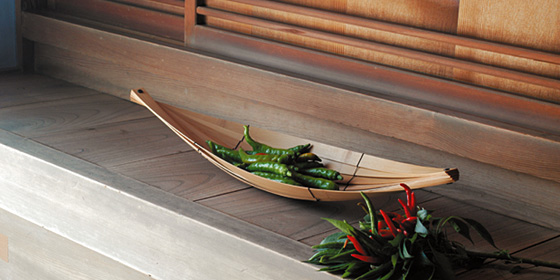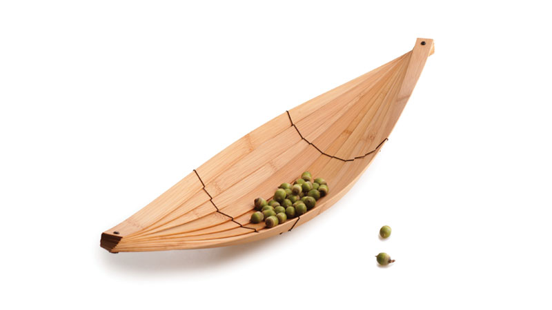 この舟形のトレーは、スライスした竹集成材をねじりながら重ね合わせることで、